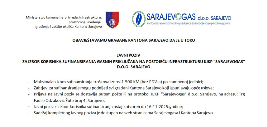 - Sufinansiranje gasnih priključaka na postojeću infrastrukturu Sarajevogasa”
